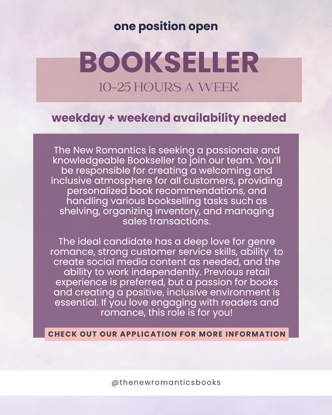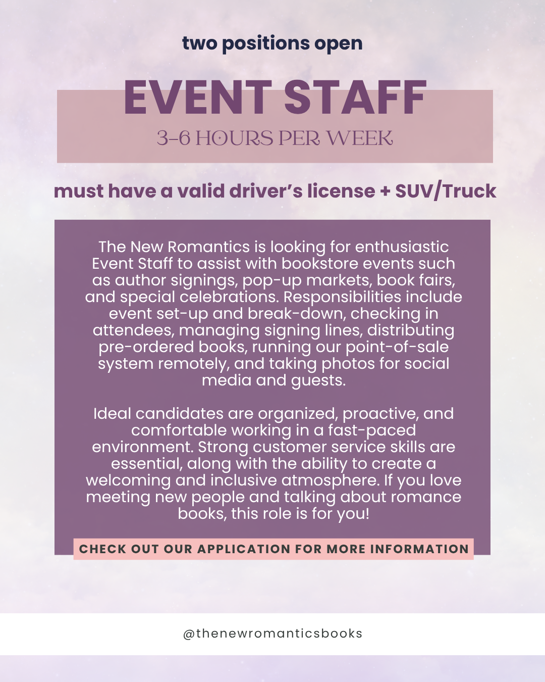 The New Romantics is seeking enthusiastic event staff to help facilitate engaging experiences for our romance-loving community. Responsibilities include welcoming customers, offering personalized book recommendations, processing sales, and supporting in-store and outdoor events.